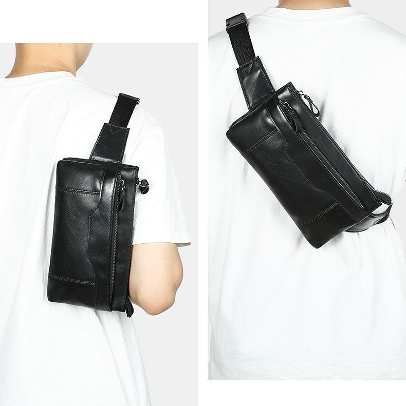 Black leather sling bag,in nearly rectangle shape.